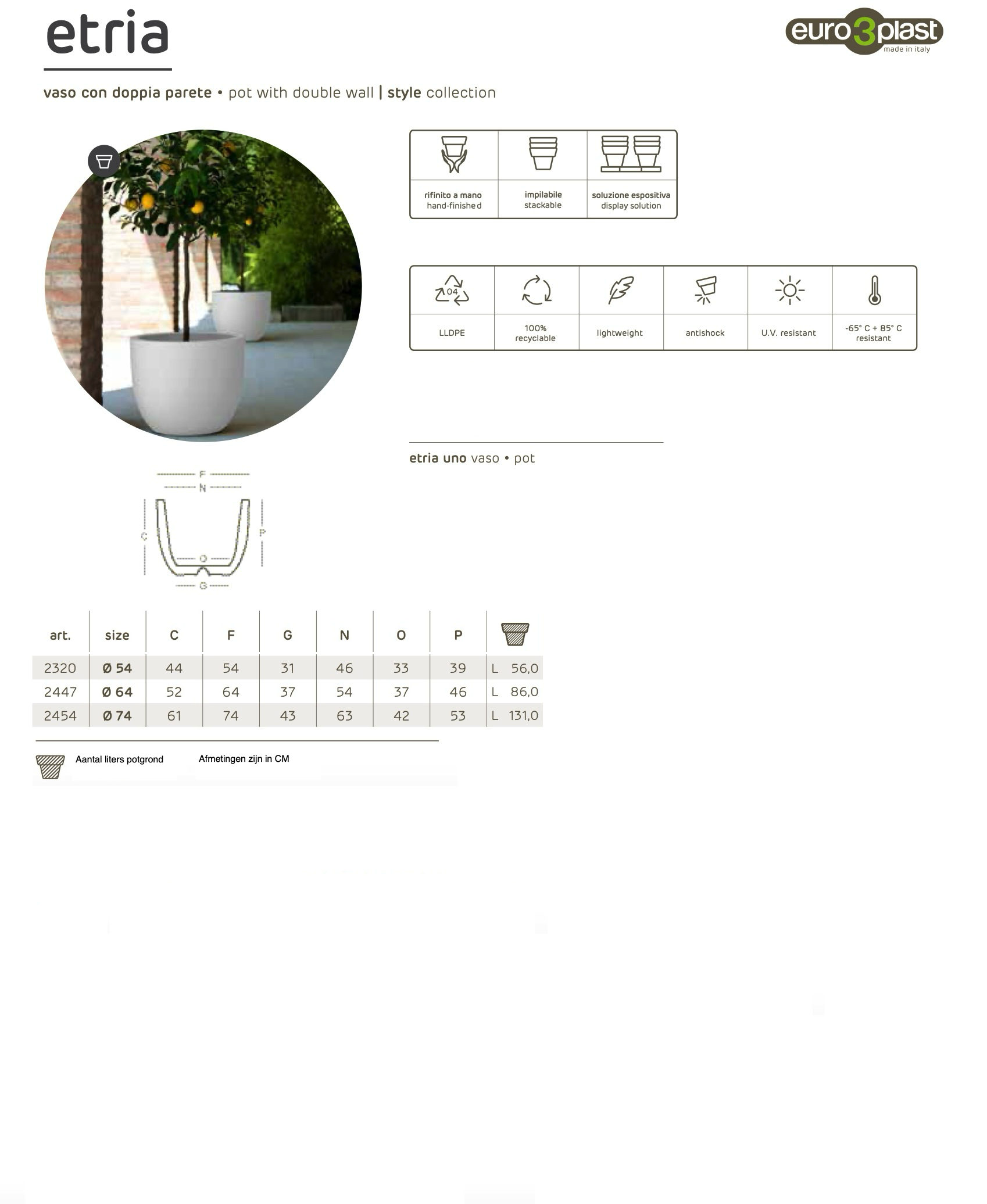De XXL Euro3Plast Etria buitenbloempot in elegant zwart (pearl black) is een indrukwekkende keuze om zowel binnen- als buitenruimtes te verfraaien. Met zijn royale afmetingen van 54 cm in diameter en een hoogte van 44 cm biedt deze XXL Etria pot een ruime capaciteit van 56 liter, waardoor hij perfect is voor het creëren van grootschalige en opvallende plantarrangementen.