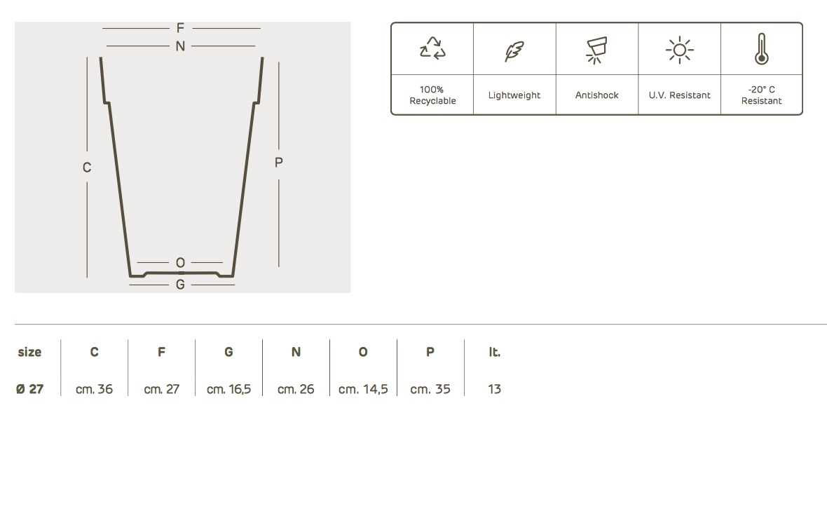 Liken bloempot van het Italiaanse merk Euro3plast, deze bloempot is gemaakt van kunsstof in de kleur rosemary en heeft een hoogte van 36 cm en een doorsnede van 27 cm. Deze buitenbloempot is een aanwinst voor uw terras of balkon.