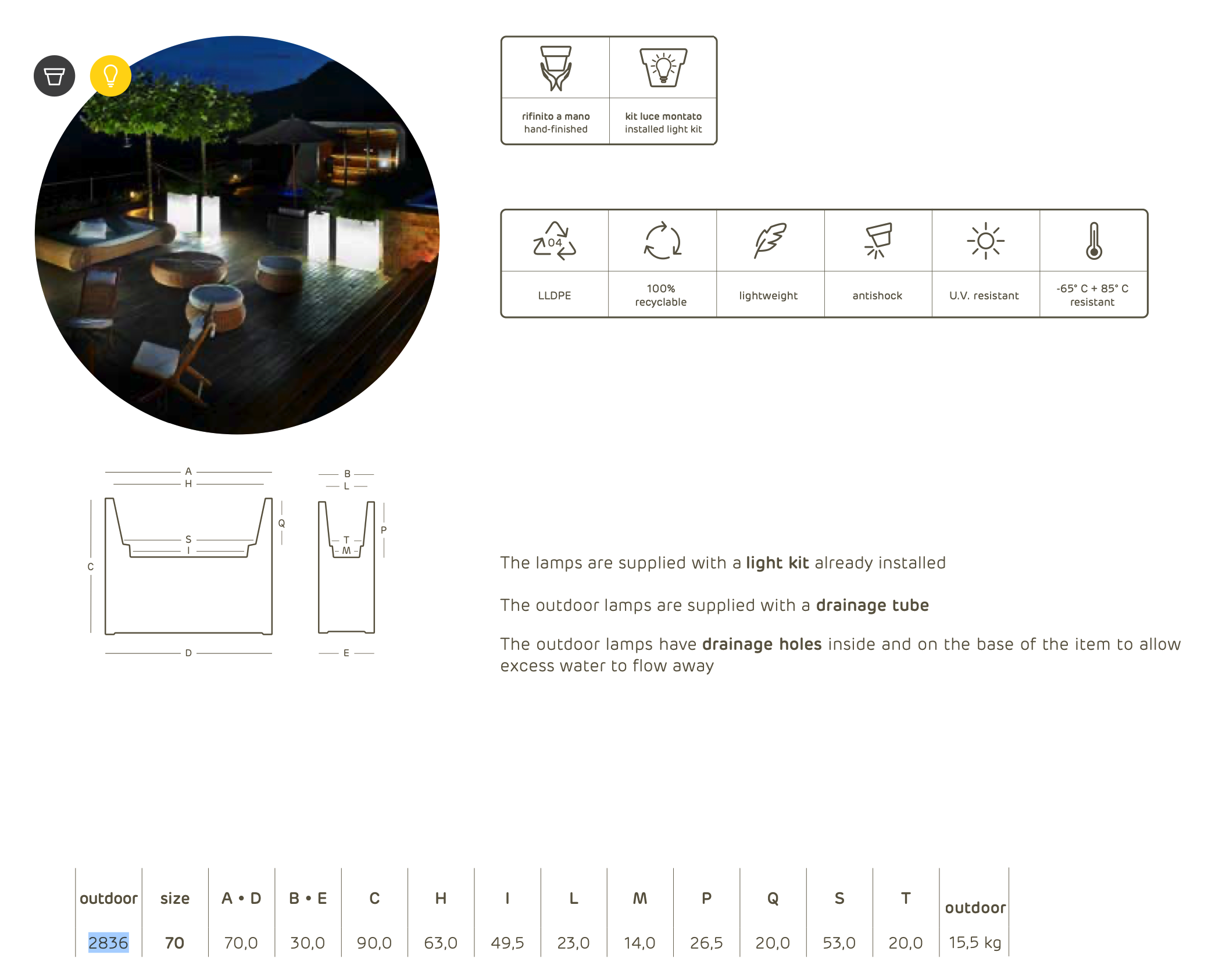 Functioneel overdag en sfeervol 's nachts, de lampen in deze collectie kunnen worden uitgerust met verlichtingskits die gegarandeerd en gecertificeerd zijn voor zowel binnen- als buitengebruik. Het krachtige licht en de verfijnde afwerking creëren een exclusieve en sfeervolle ambiance in elke omgeving.