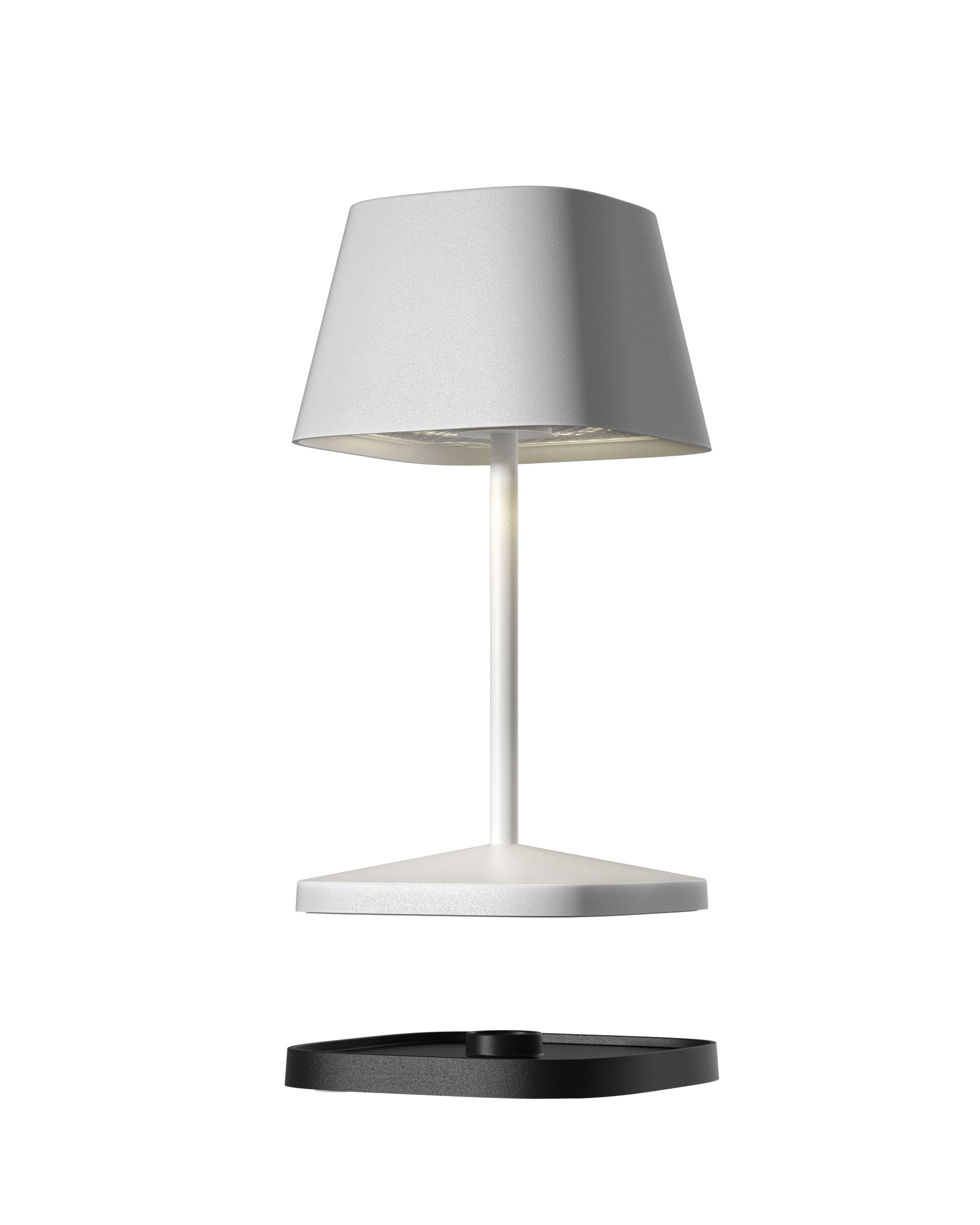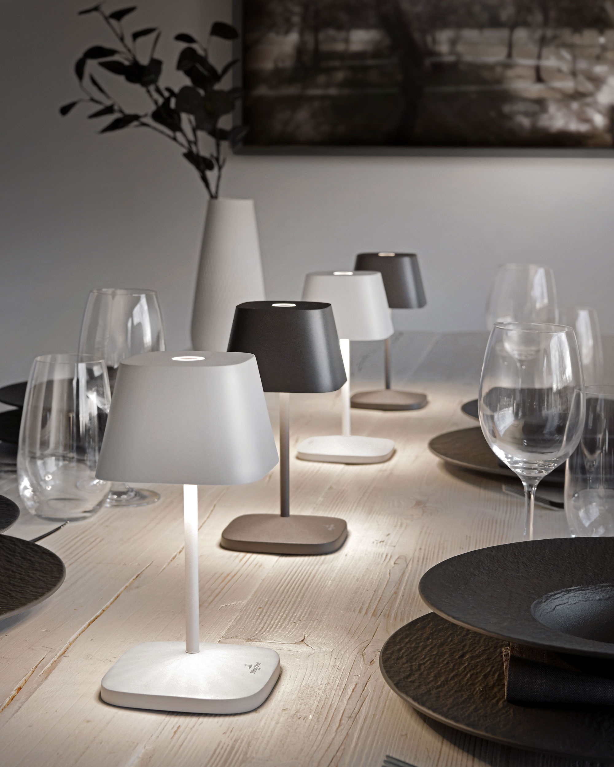 Via de touch-dimmer op de bovenzijde kan de lichtsterkte traploos worden aangepast en kan worden gewisseld tussen twee warmwitte lichtkleuren (2200K & 3000K). De geïntegreerde accu wordt eenvoudig opgeladen via de meegeleverde laadstation.